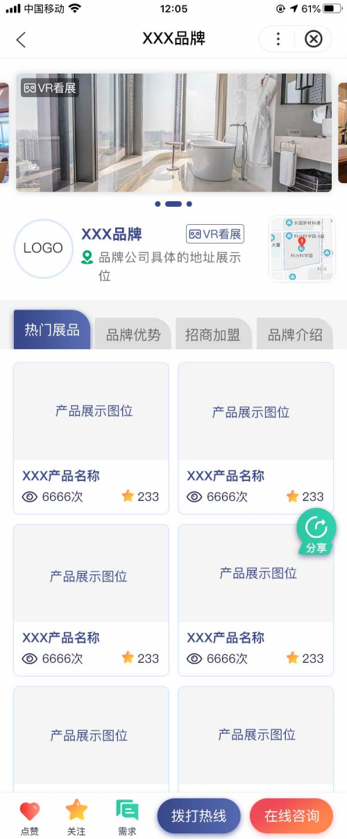 在展會(huì)中,通過(guò)百度VR技術(shù)搭建沉浸式“云展廳”,讓客戶(hù)足不出戶(hù)就可看到產(chǎn)品細(xì)節(jié)甚至廠(chǎng)家全景,突破時(shí)間和地域限制,讓客戶(hù)如臨現(xiàn)場(chǎng)般地參觀(guān)工廠(chǎng)、體驗(yàn)產(chǎn)品和服務(wù)。商家既可以制造相關(guān)的內(nèi)容話(huà)題,又可以直接實(shí)現(xiàn)線(xiàn)上帶貨和招商。